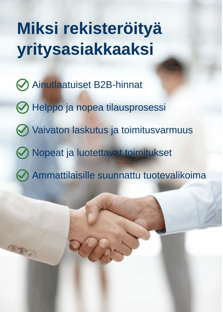 Yritysasiakkaana pääset hyötymään myös sujuvasta verkkolaskutuksesta, selkeistä toimituskäytännöistä ja ammattiasiakkaille suunnatuista tuotevalikoimista.